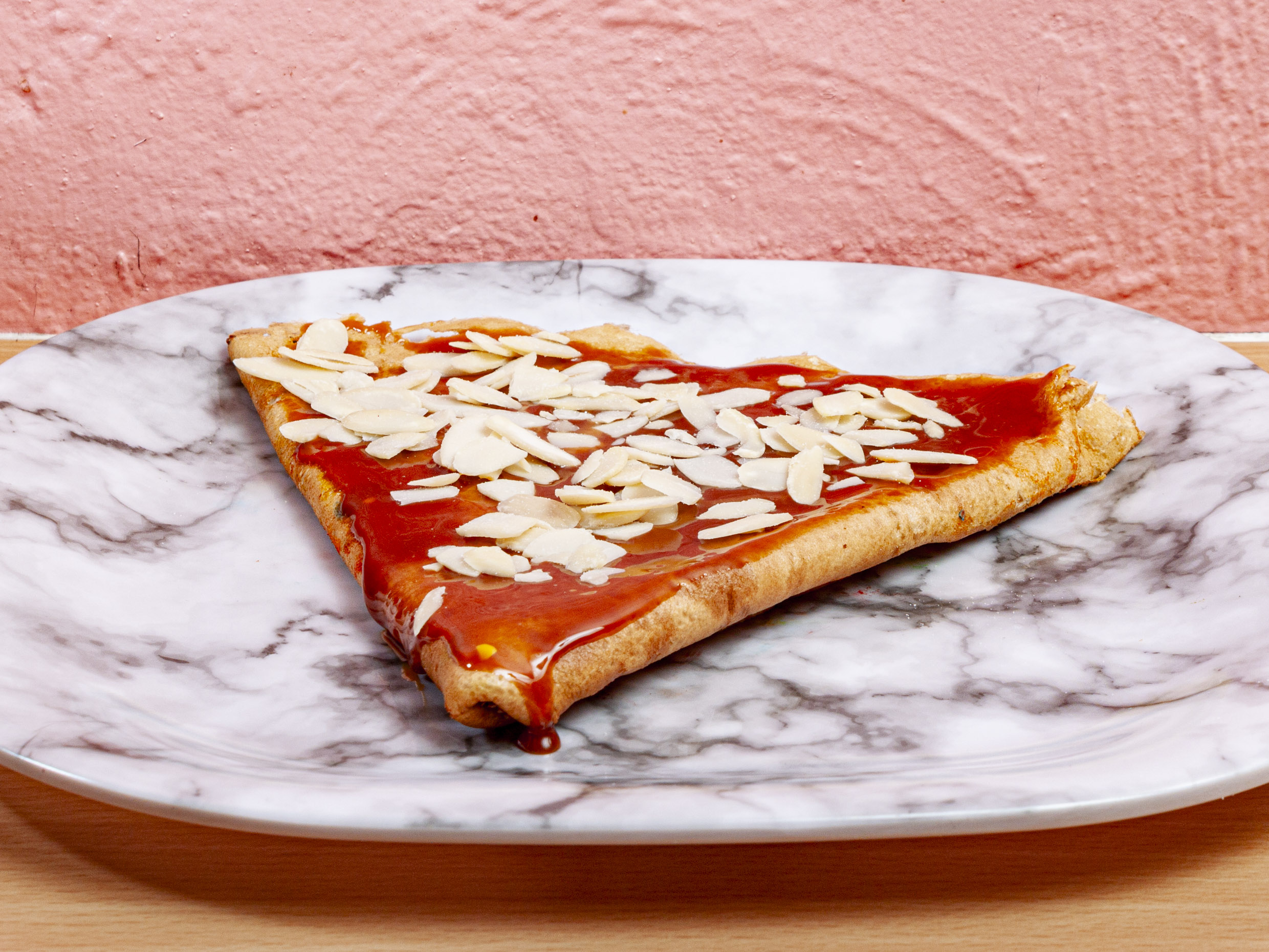 Crepa de dulce de leche y almendras con topping y espolvoreado a tu elección.