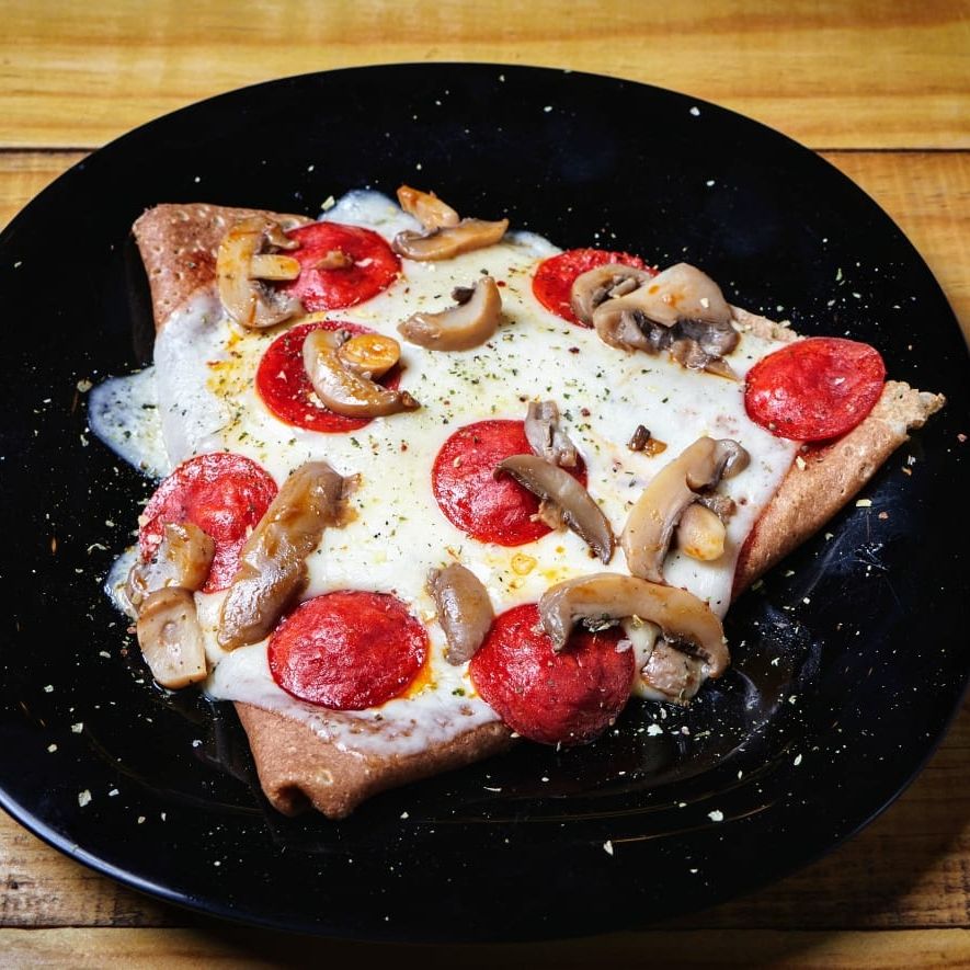 Puré de tomate, mozzarella, parmesano, champiñones y pepperoni.