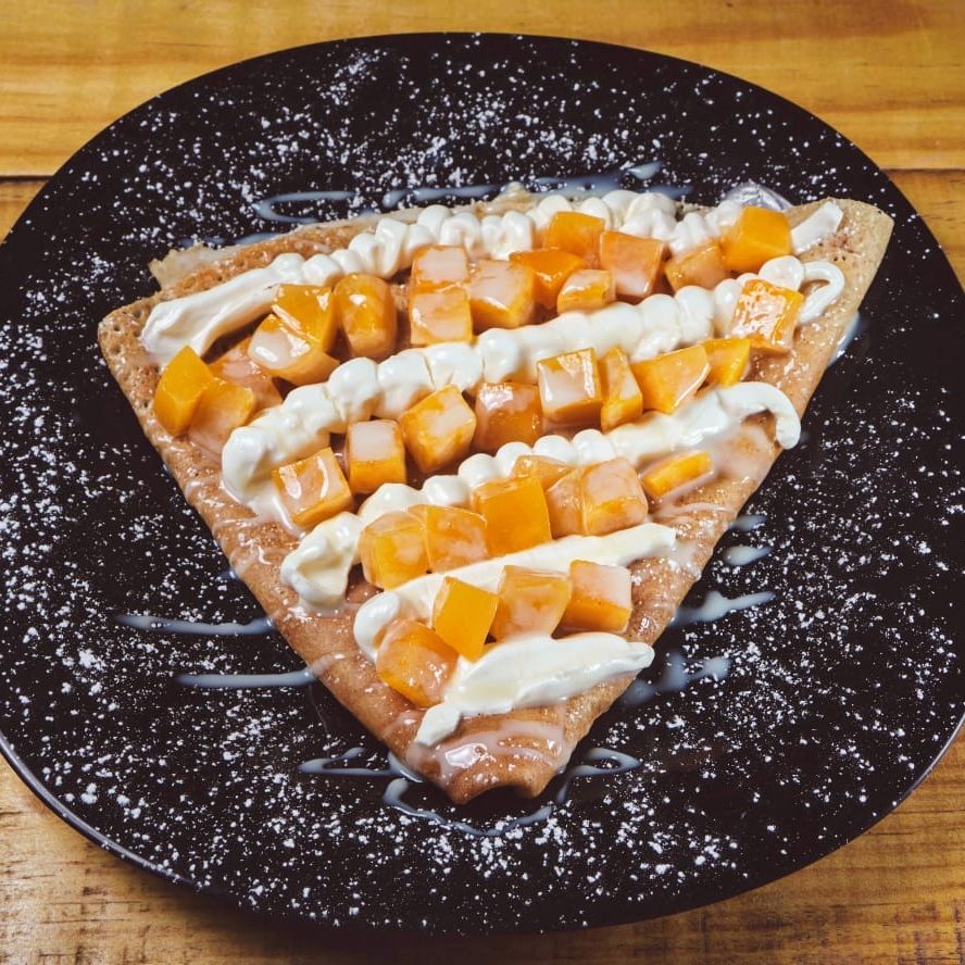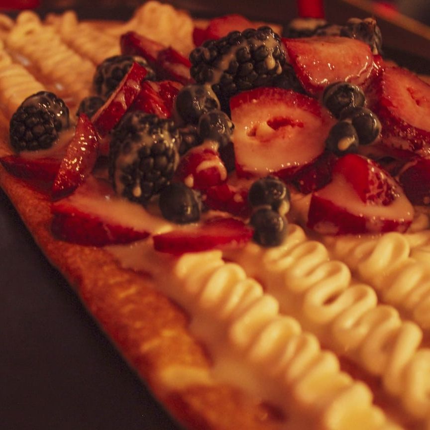 Nutella, philadelphia, moras, durazno, fresa y frambuesa.