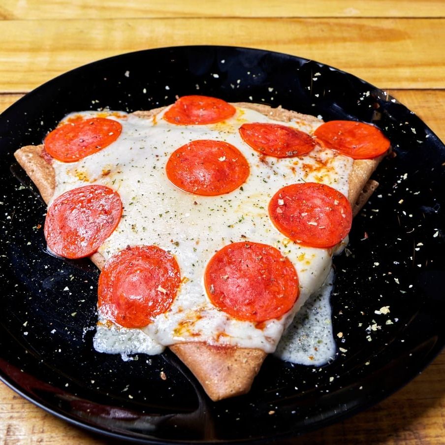 Puré de tomate, mozzarella, parmesano y pepperoni.