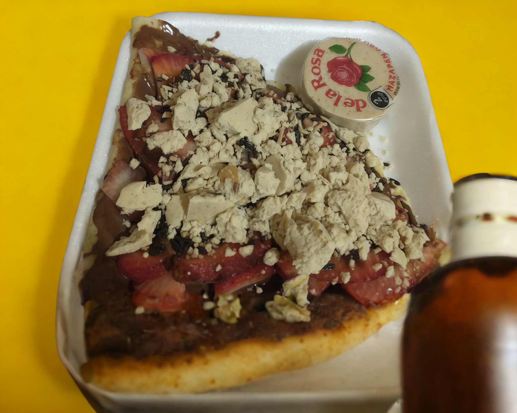 De base eliges entre lechera, nutella, cajeta o mermelada de fresa o zarzamora, arriba granillo de chocolate y un delicioso dulce de kinder delice, los tubitos de chocolate son a disposición de la tienda