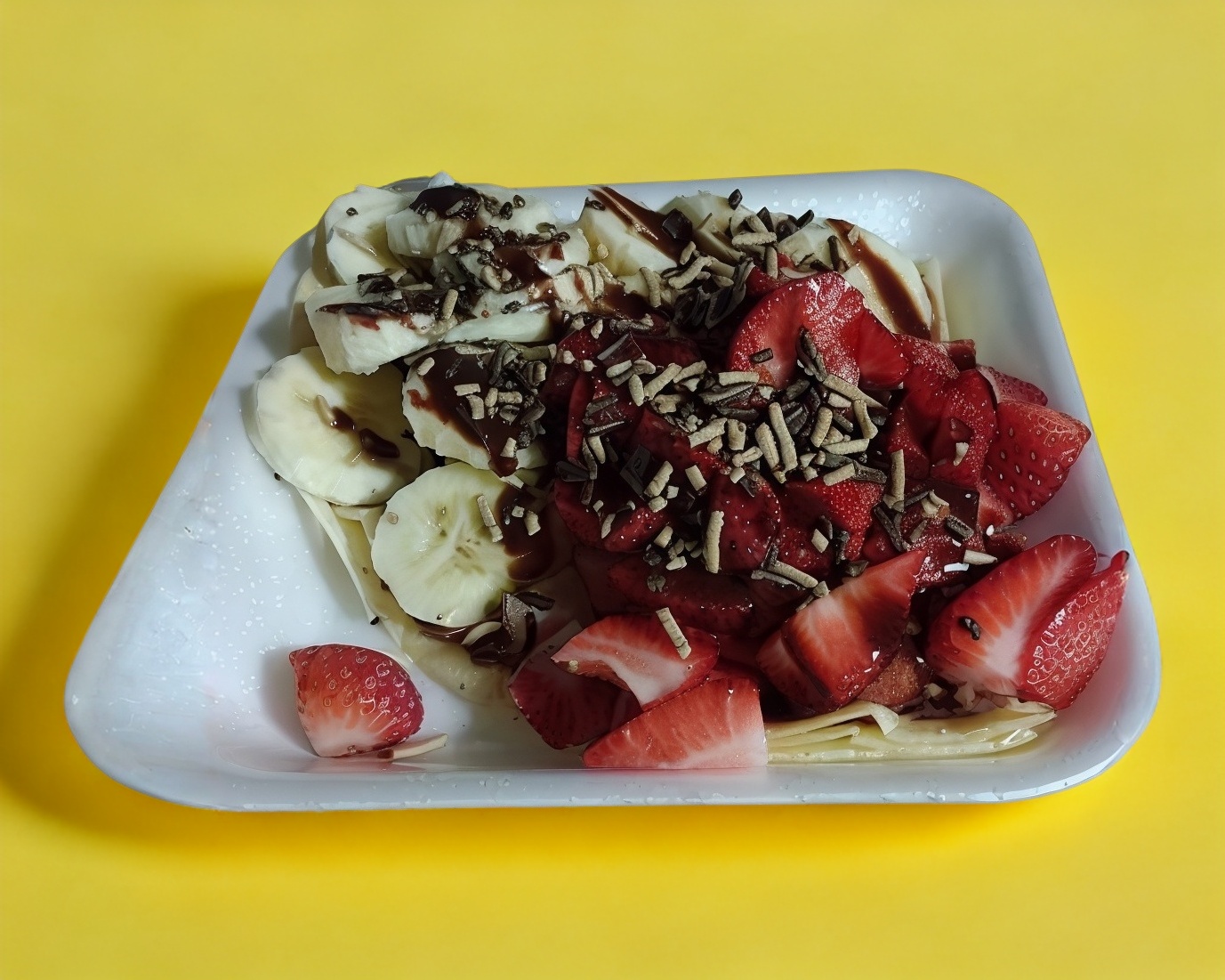 Base de nutella, plátano y fresa, arriba chocolate líquido y granillo de chocolate
