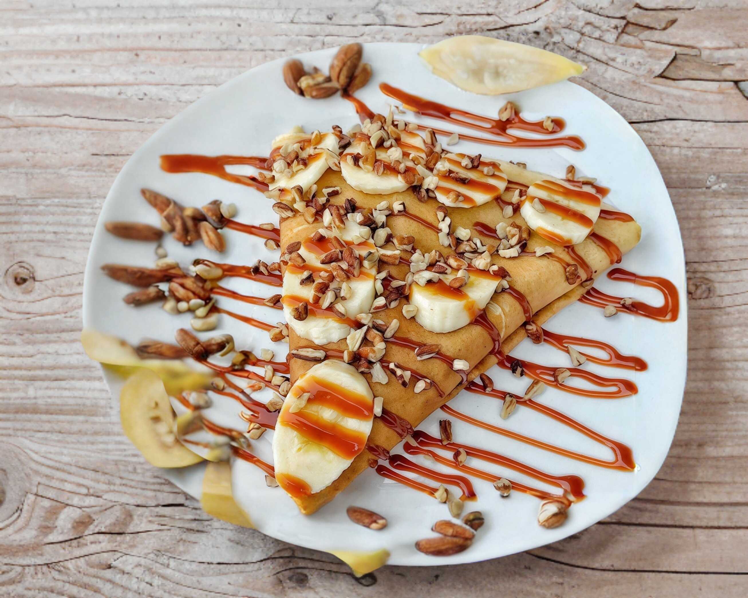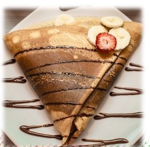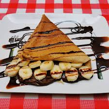 Crepa con nutella, fresa, durazno, kiwi y jarabe de chocolate.