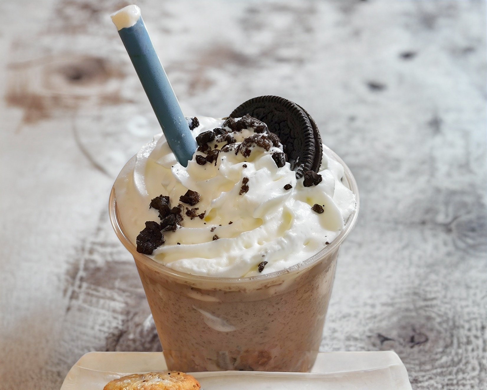 Frappe 16 oz base leche sabor oreo con un poco de crema batida y jarabe de chocolate.