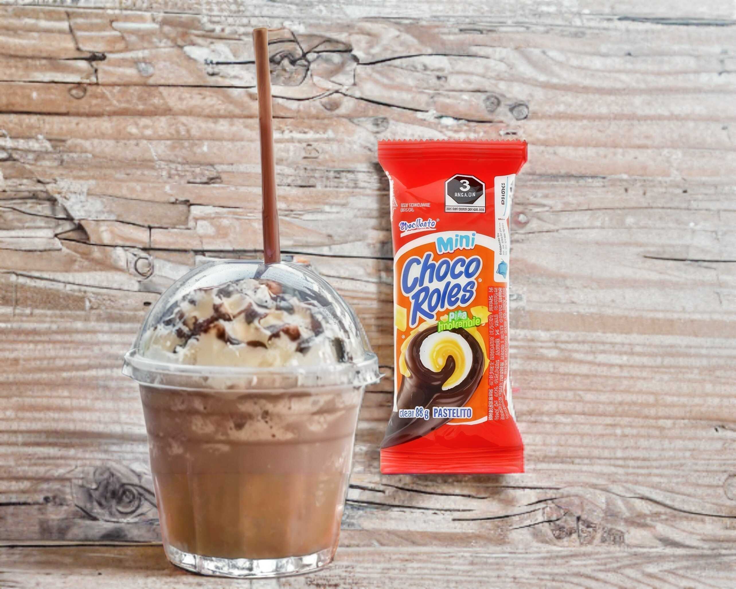 Frappe 16 oz base leche sabor choco rol con un poco de crema batida y jarabe de chocolate.