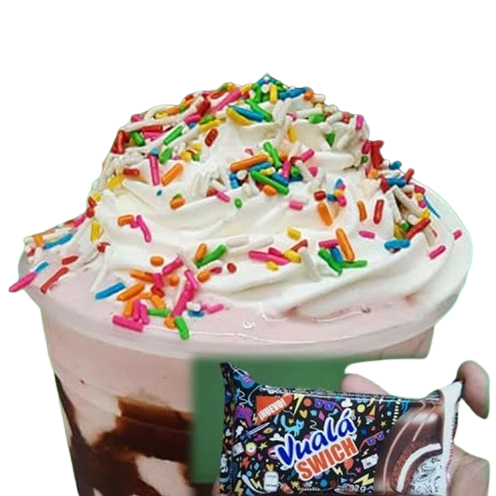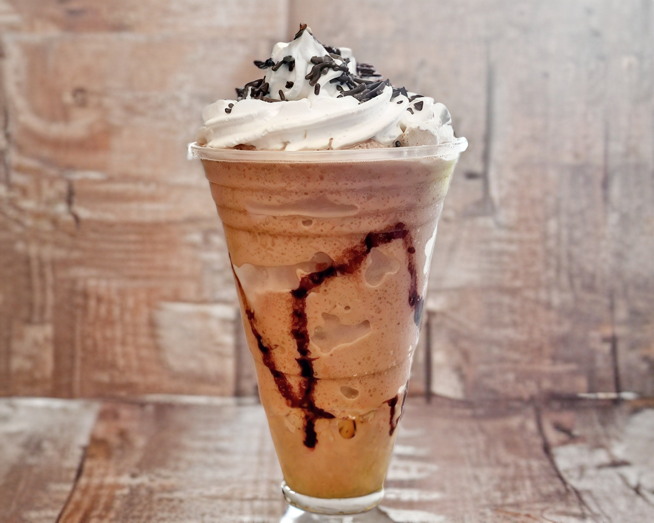 Frappe 16 oz base leche sabor vuala con un poco de crema batida y jarabe de chocolate.