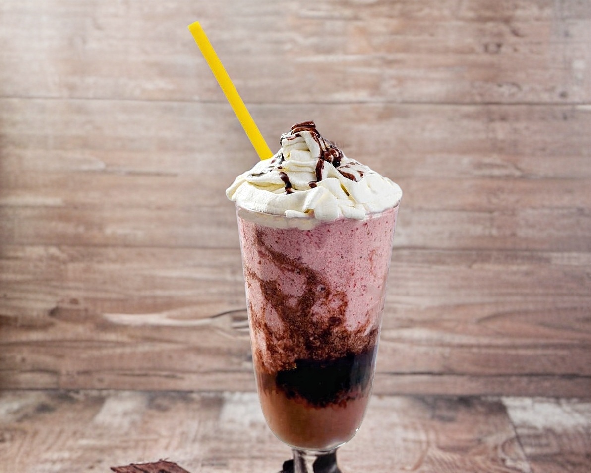 Frappe 16 oz base leche sabor fresa con un poco de crema batida y jarabe de chocolate.