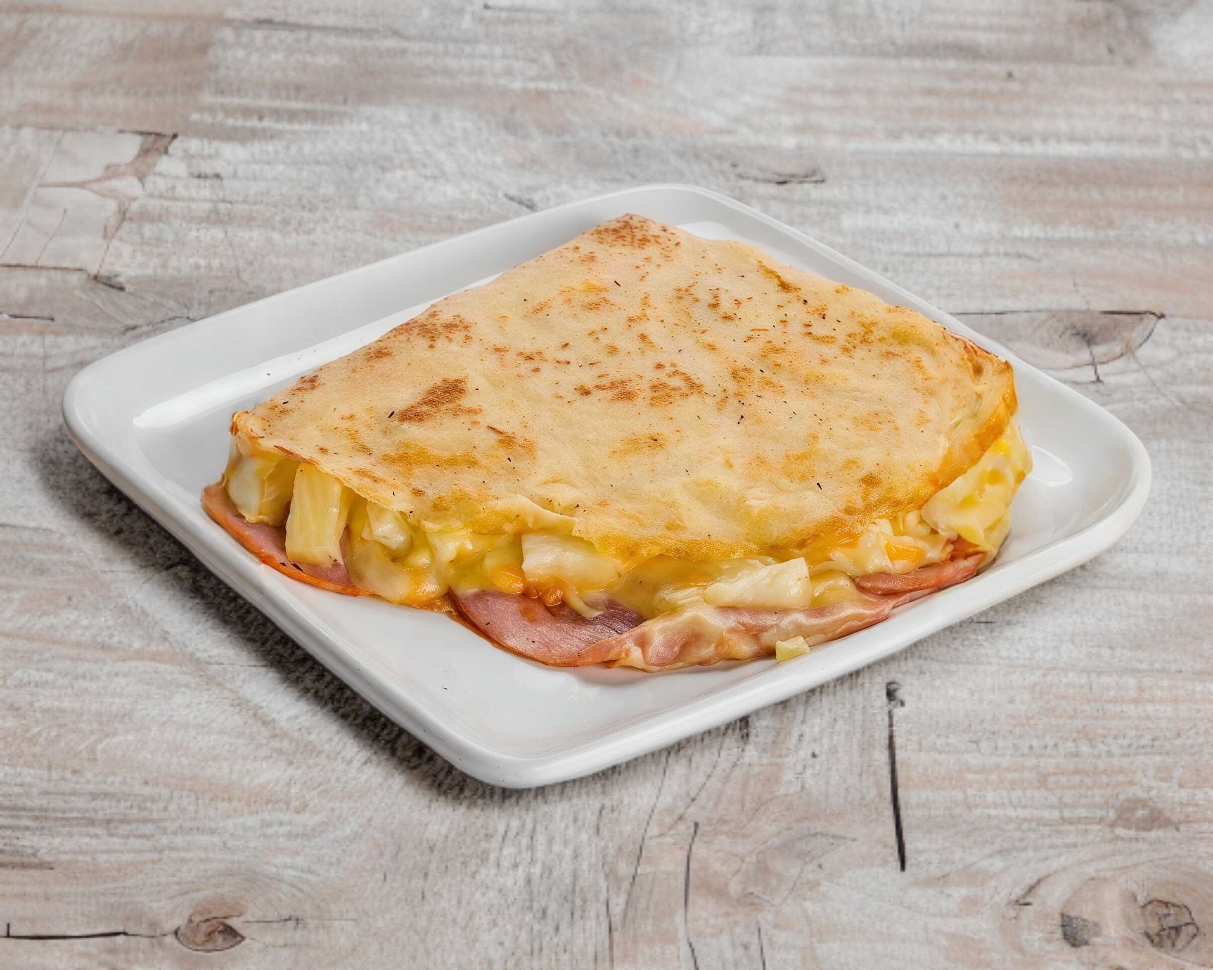 Porción personal: Crepa con salsa de tomate, trocitos de cuaresmeño, queso, jamón y piña.