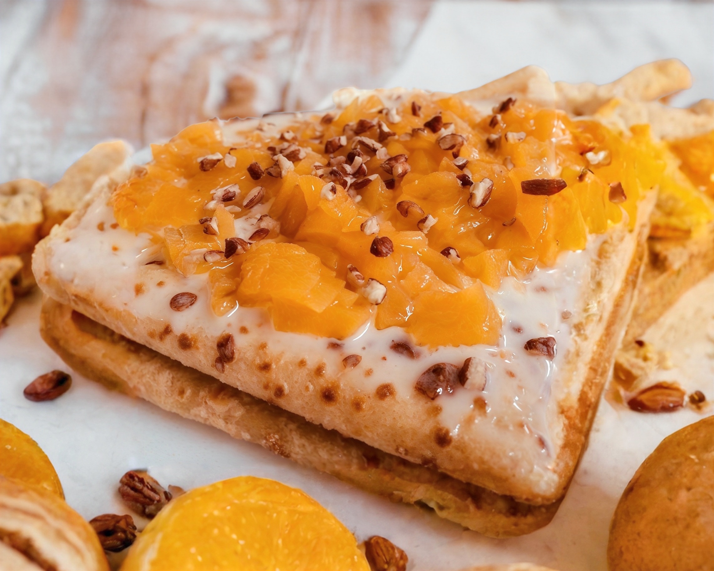 Crepa con durazno en almíbar con philadelphia y lechera.