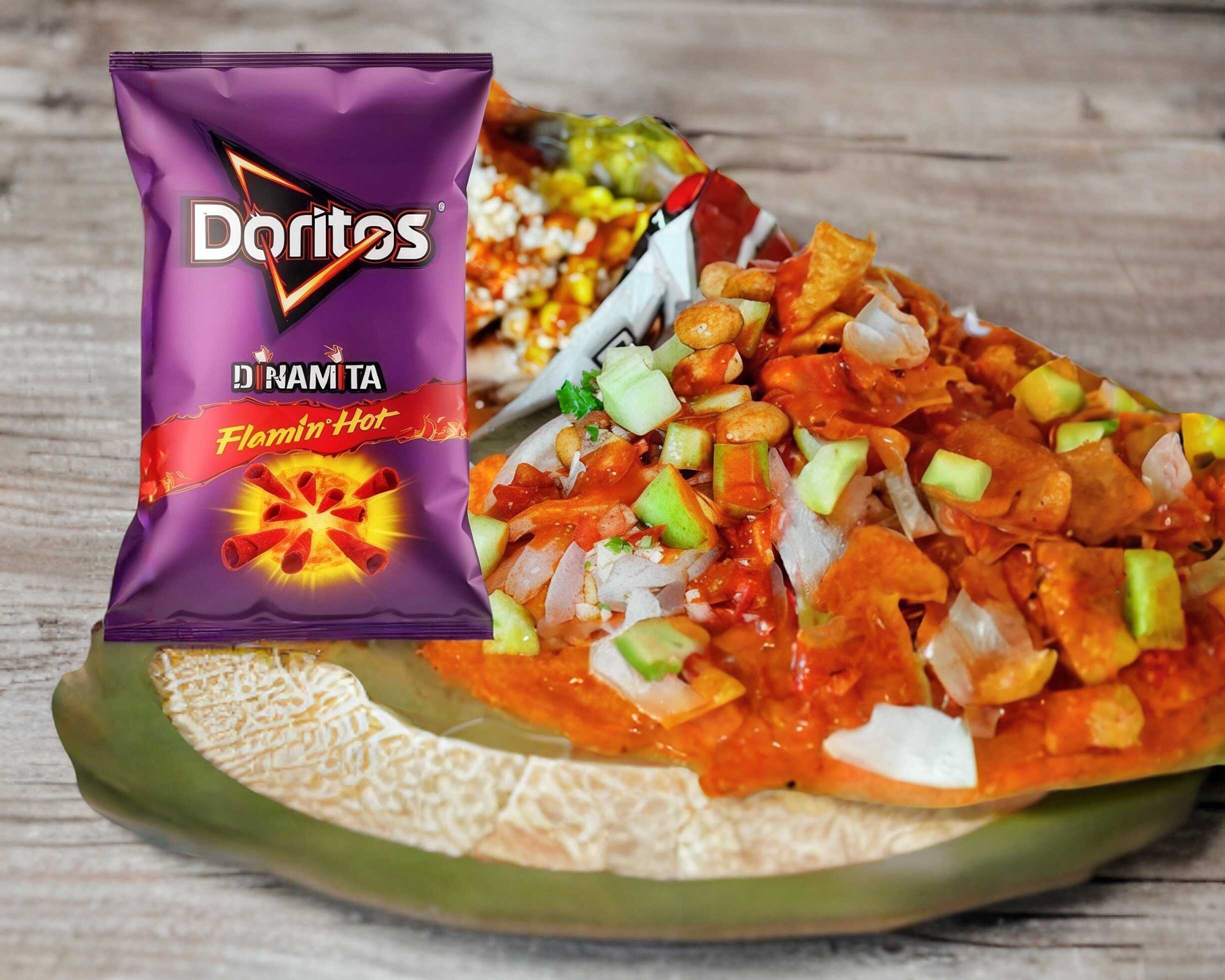 Doritos dinamita flamin hot con zanahoria, jícama, pepino, cacahuates, gomitas, tajín, salsa y chamoy.