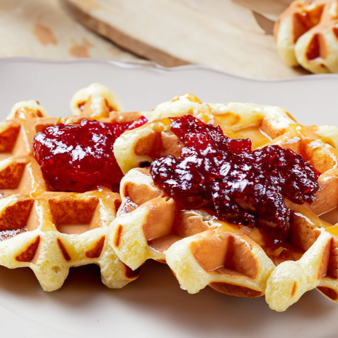 Orden de 14 mini wafles acompañados de mermelada de frutos y Philadelphia