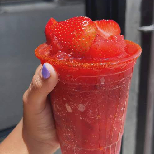 Frappe de fresa natural base agua, acompañado de chamoy y Miguelito en el vaso