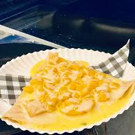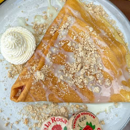 Crepa con relleno de crema cacahuate y mazapan,decorado con dulce de leche, espolvoreado de mazapan