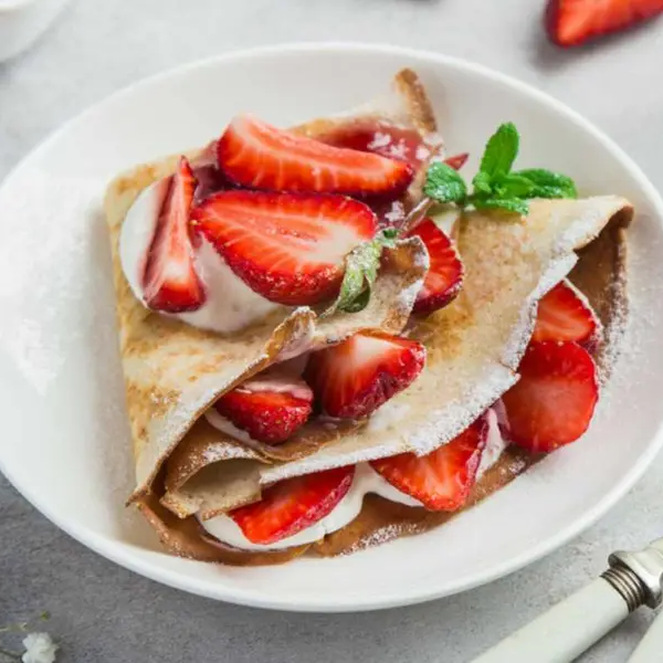 Deliciosa crepa con relleno de Philadelphia y mermelada de frutos rojos, acompañada de lechera y azúcar glas