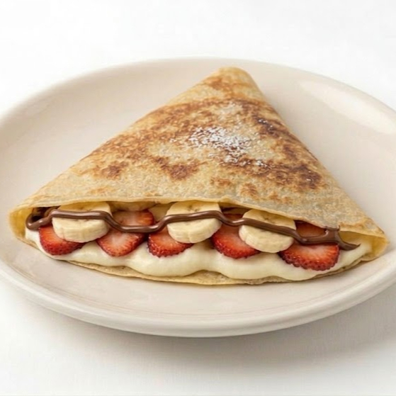 Crepa de Queso Philadelphia con plátano, fresa, durazno y chocolate.