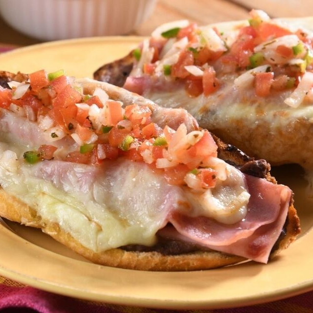 2 mitades de bolillo preparados con frijoles, jamón y q. manchego, acompañado de pico de gallo