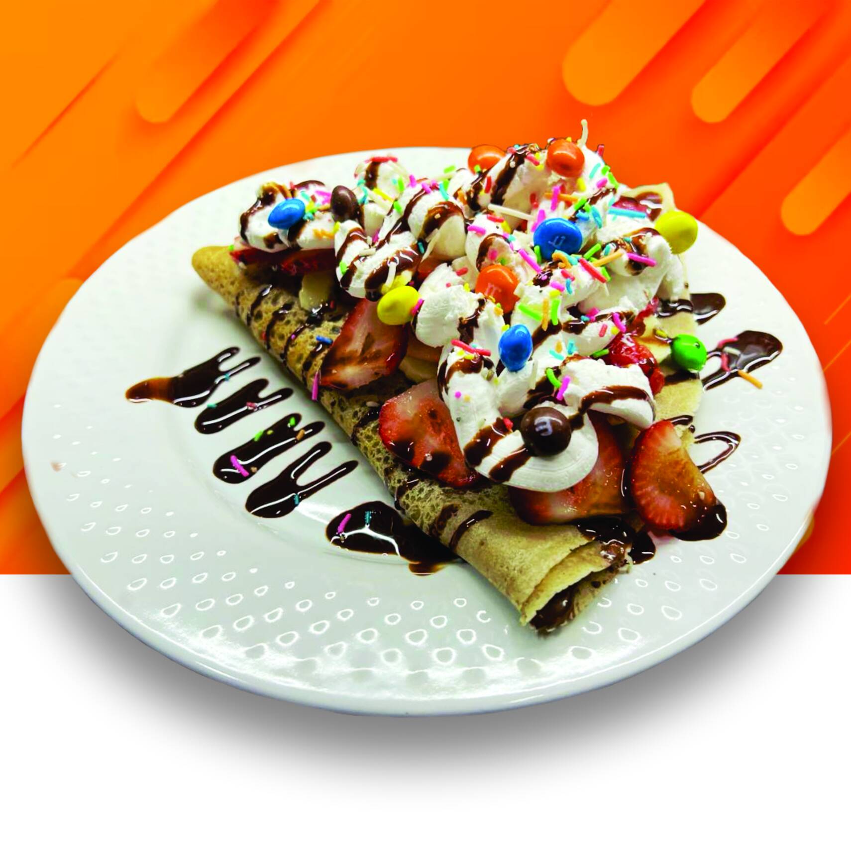 Crepa de Nutella con fresa, chantilly, lunetas y chispas de colores.