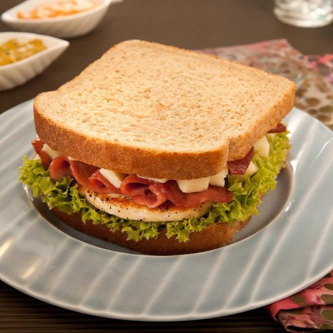 Pan integral de caja con lechuga, q. panela, jitomate, aguacate, mayonesa, cebolla y la proteina que elijas.