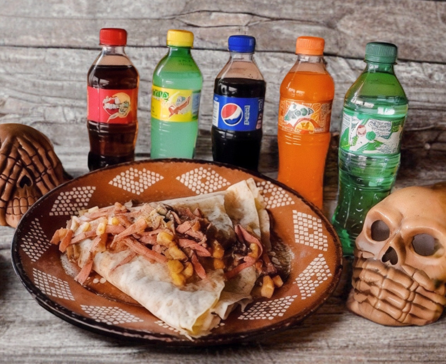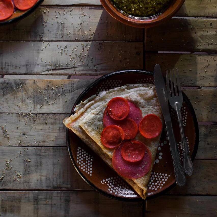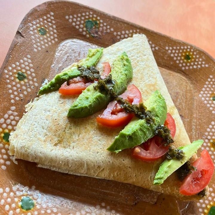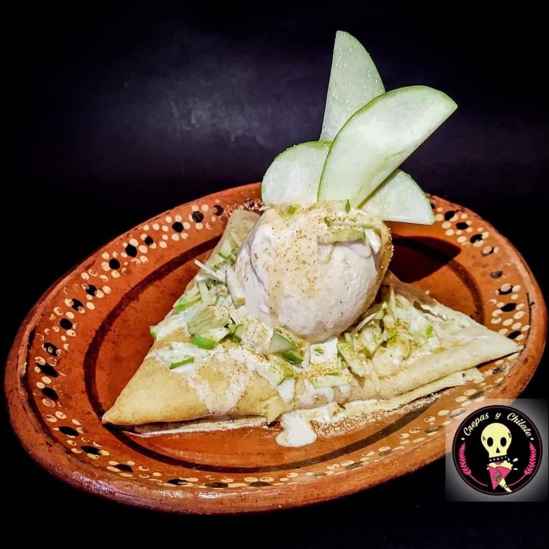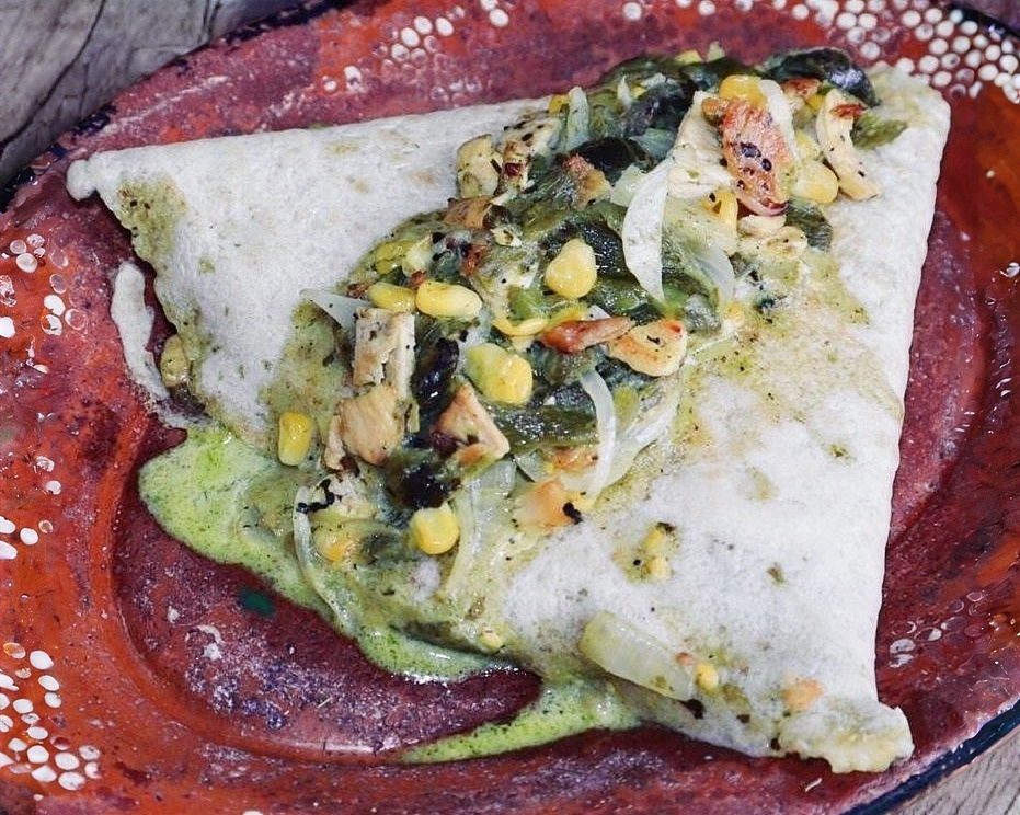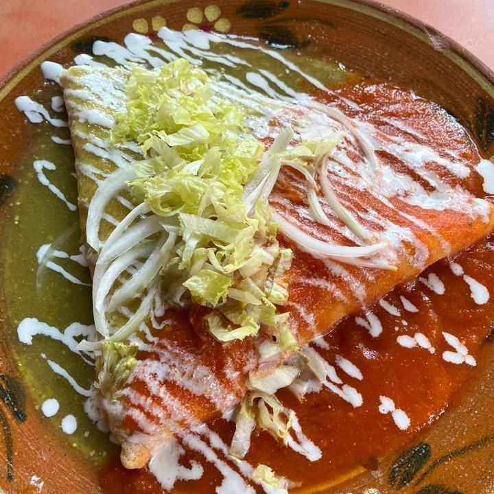 Crepa rellena de pechuga de pollo con 4 quesos, acompañada de cebolla, crema y lechuga. Bañada en salsa verde, roja o divorciada.