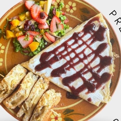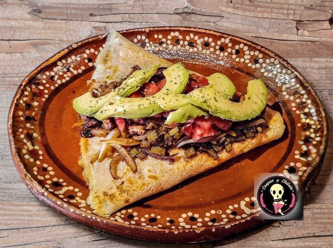 Crepa rellena de 4 quesos con relleno de su preferencia y un par de huevos revueltos o estrellados por encima
