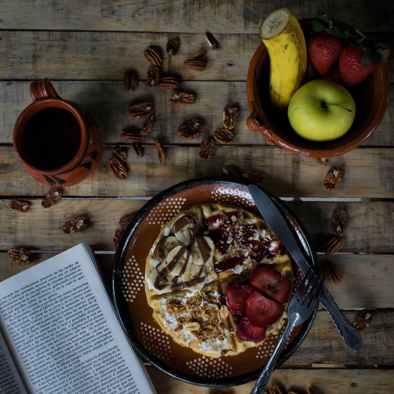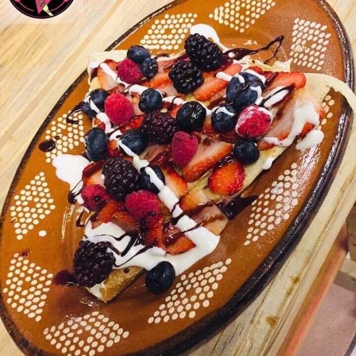 A escoger una fruta: fresa, plátano, durazno, manzana y una mermelada: de fresa, zarzamora, cajeta, crema de coco, lechera, chocolate.