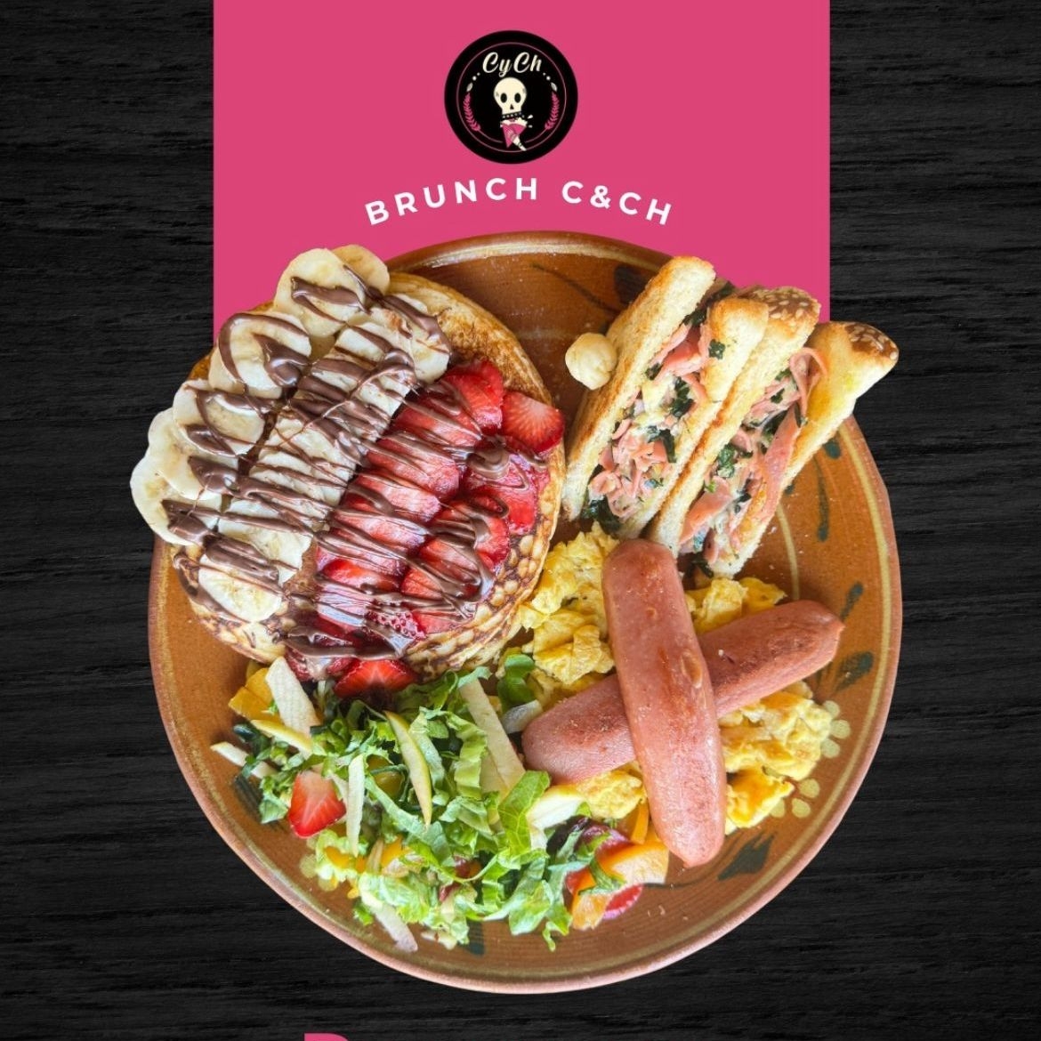 Sandwich tres quesos con jamón y espinaca, huevo revuelto, salchicha asada, ensalada y 2 hotcakes c/ Nutella, plátano y fresa