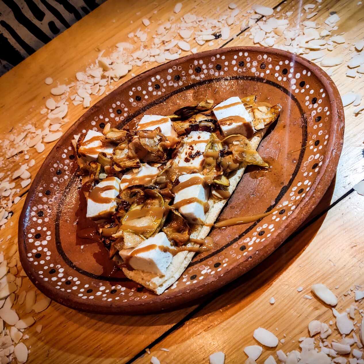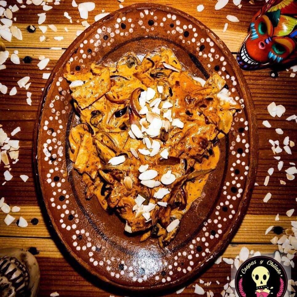 Base de 4 quesos, pollo sofrito con cebolla y champiñones bañada en crema de chipotle con almendra tostada.