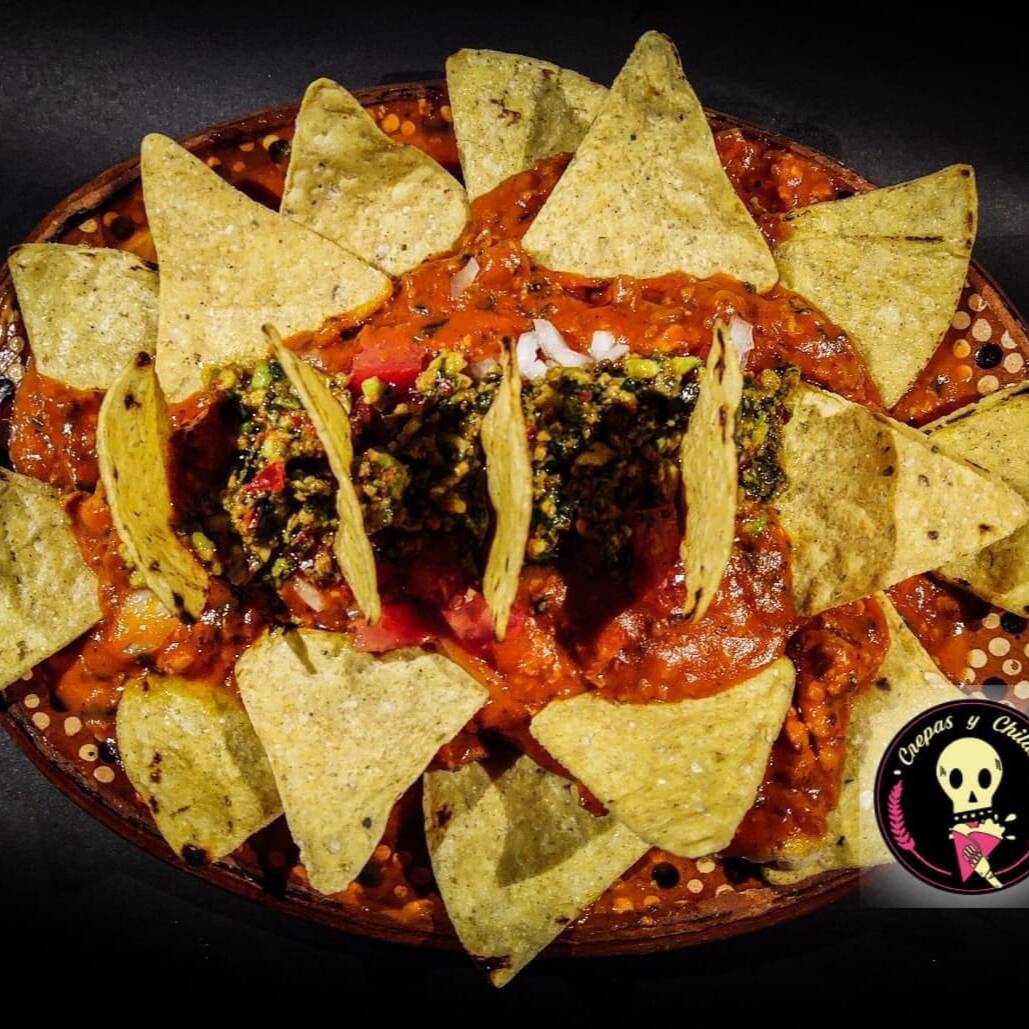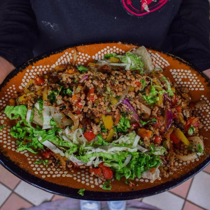 Carne molida, guacamole, pico de gallo y salsa de quesos.