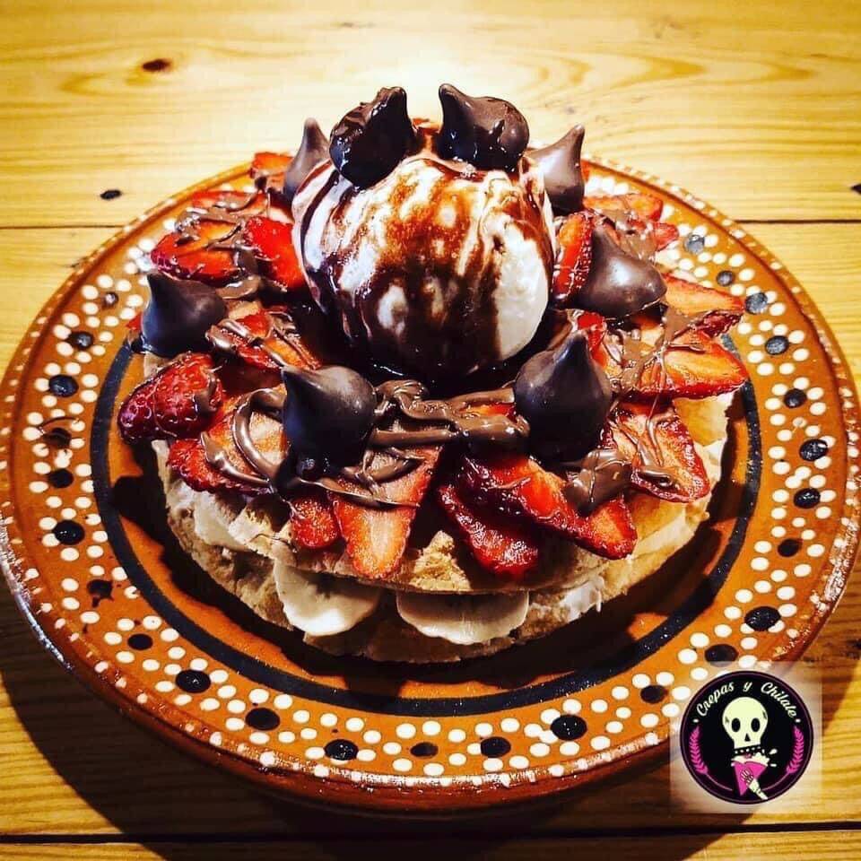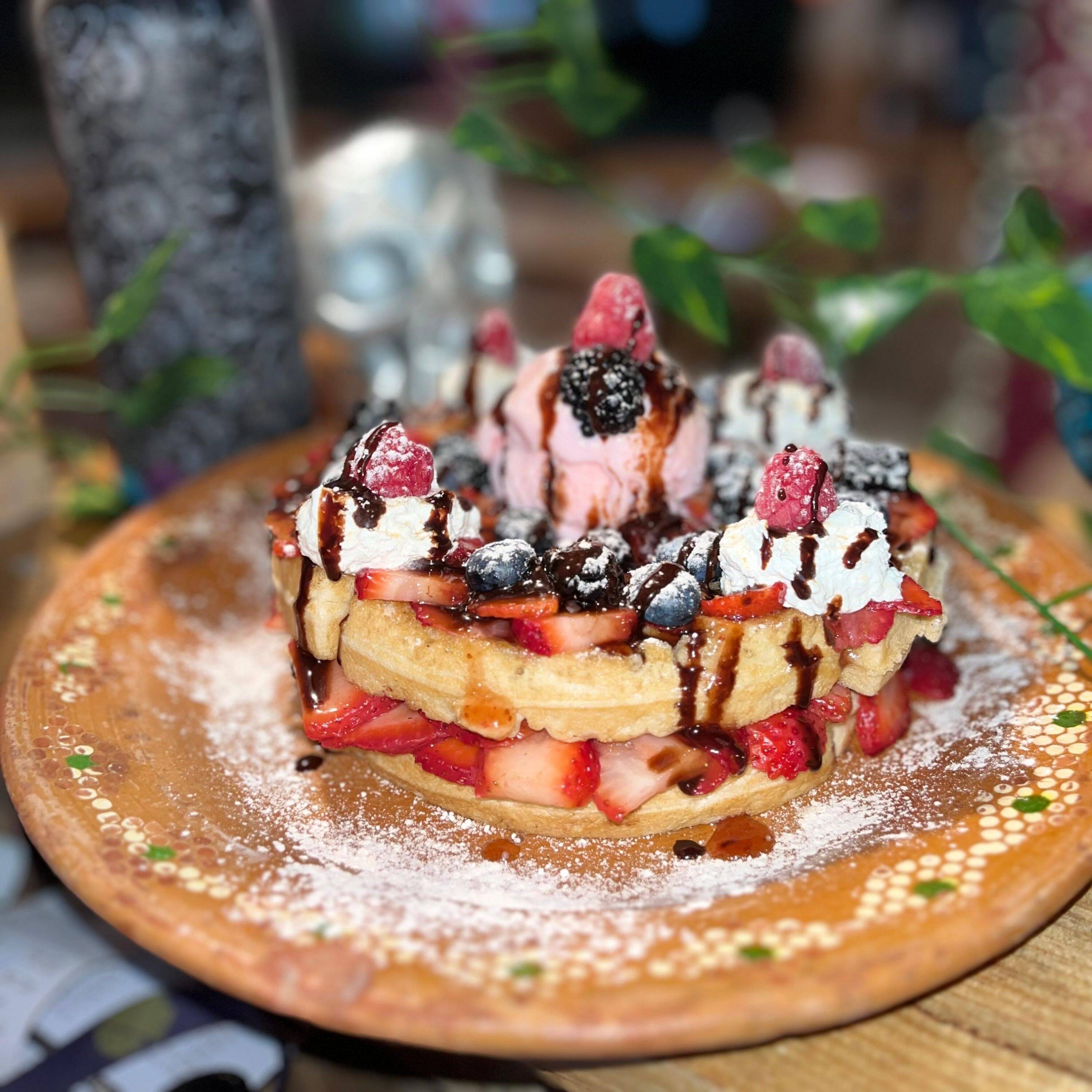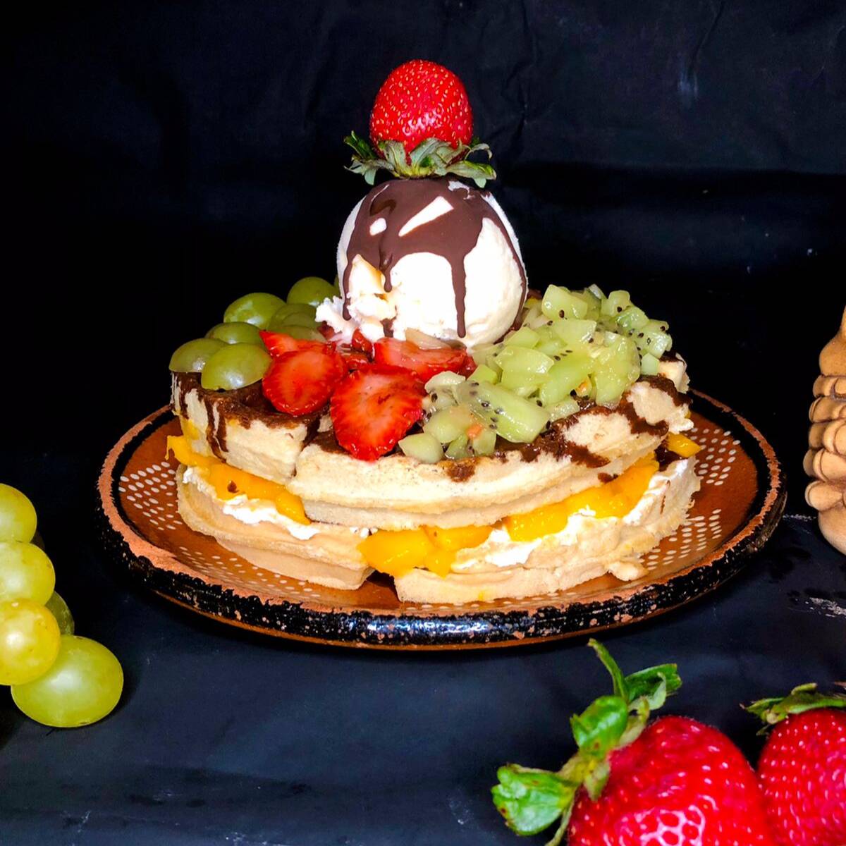 Doble waffle belga con base de Philladelphia, fresas, mango, kiwi, uva, helado de vainilla con cobertura de chocolate semi amargo.