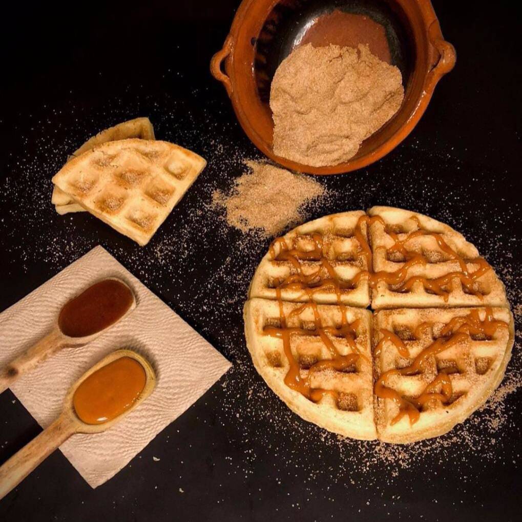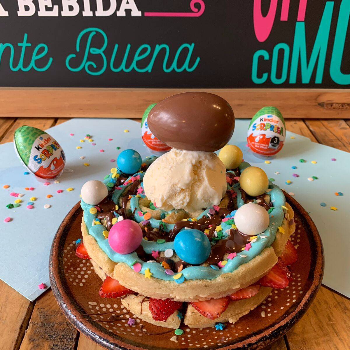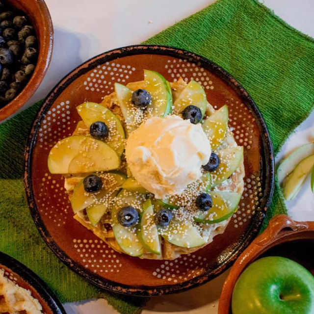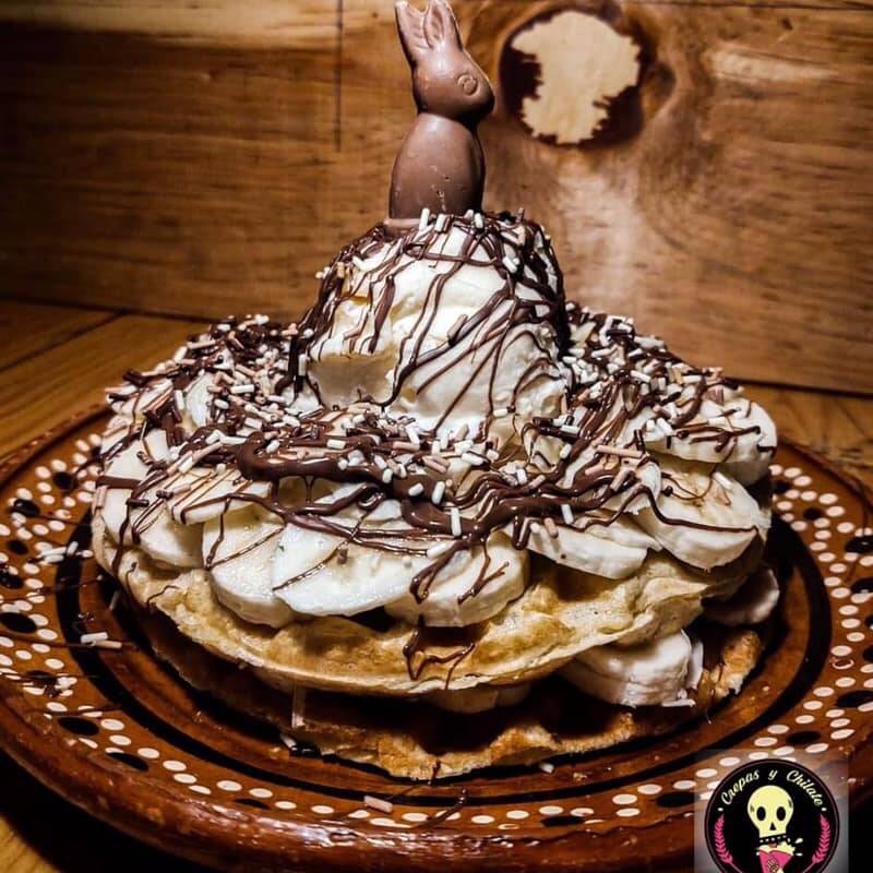 Doble waffle belga con base de Philladelphia, fresas, mango, kiwi, uva, helado de vainilla con cobertura de chocolate semi amargo.