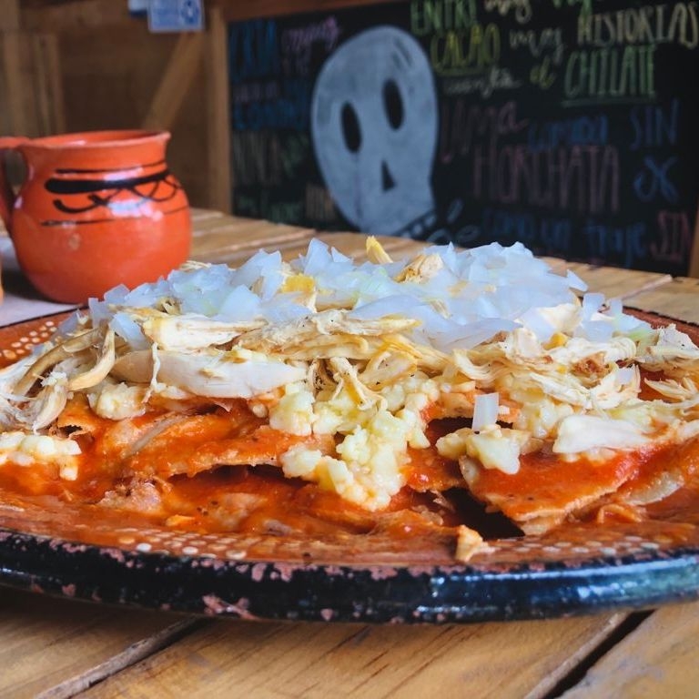 Chilaquiles crujientes bañados en la salsa de tu preferencia, acompañados de queso, crema, cebolla y la proteína de tu preferencia