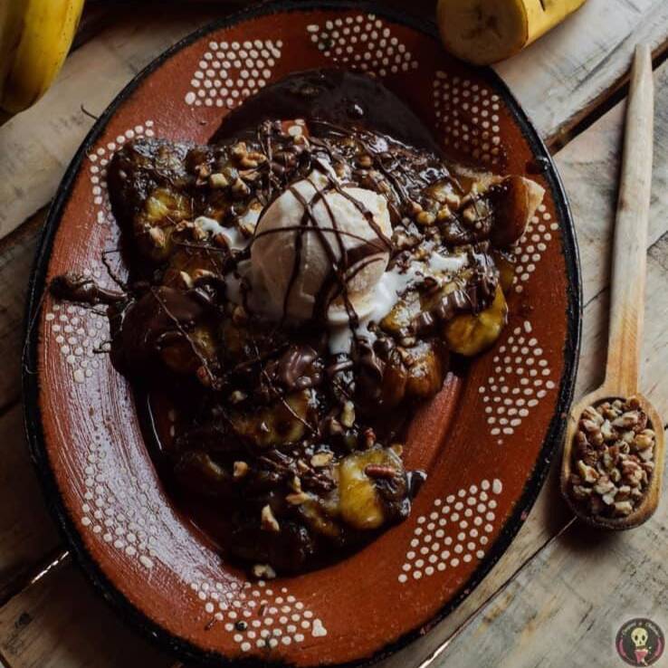 Plátanos flameados, Nutella, helado de vainilla y nuez.