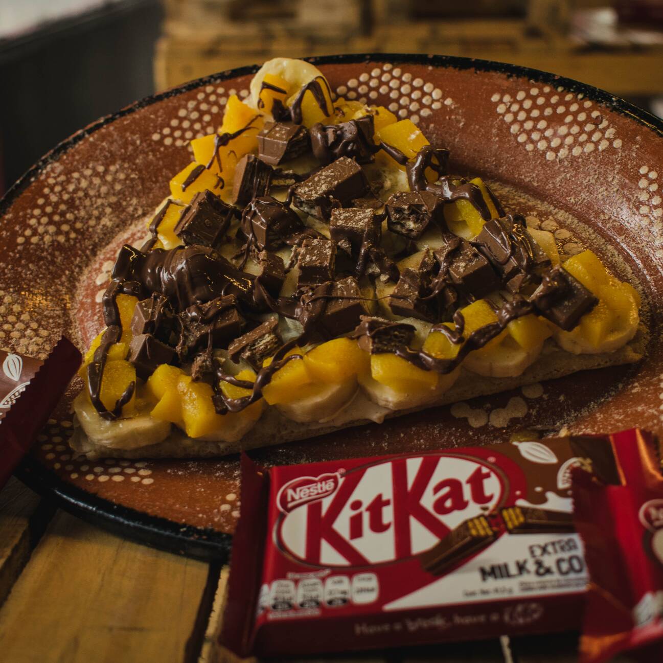Philadelphia, plátano, durazno, Nutella y barra de chocolate Kit Kat.
