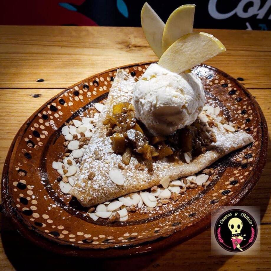 Strudel de manzana con durazno, nuez, almendras, pasas, helado de vainilla, Philadelphia y azúcar glass.