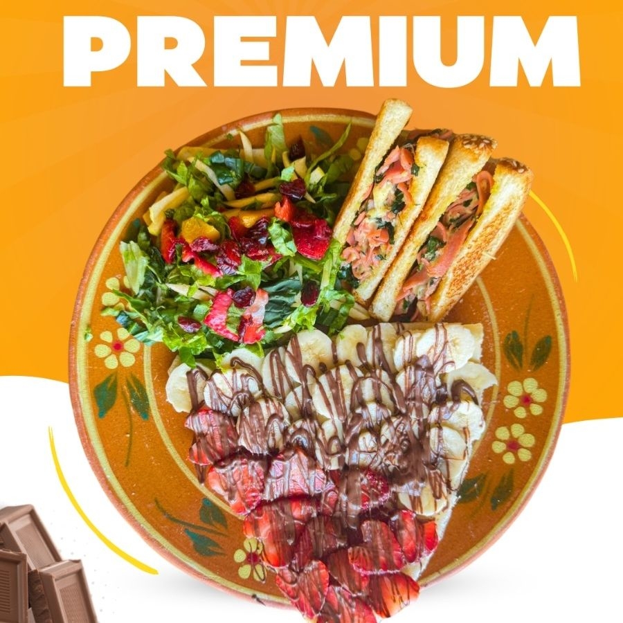 Sandwich a elegir, ensalada, crepa de Philadelphiacon Nutella, fresa y plátano