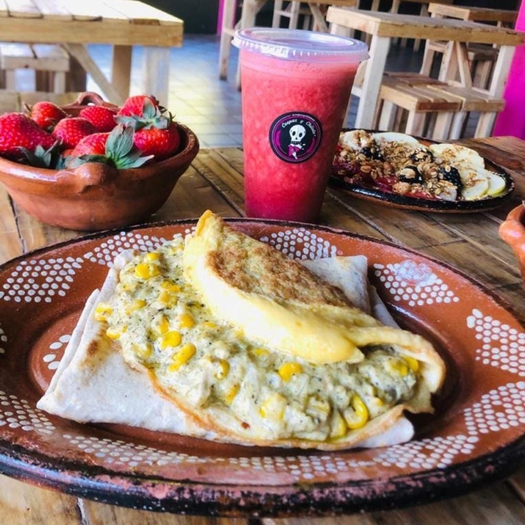 Omelette de pollo con queso, bañado en salsa verde o roja, chilaquiles, frijoles y ensalada