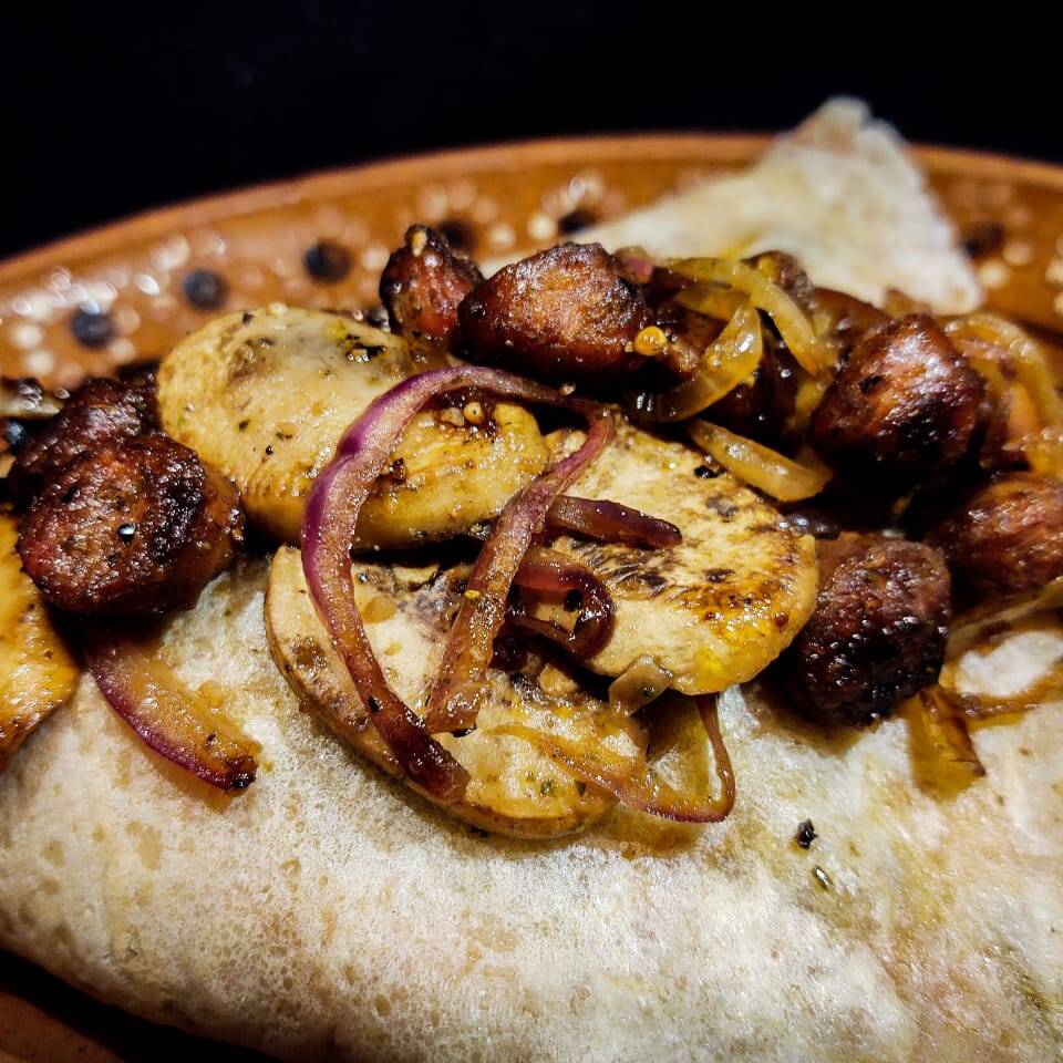 Crepa rellena de pechuga de pollo y 4 quesos, acompañada de crema, cebolla y lechuga. Bañada en salsa Suiza o Encacahuatada
