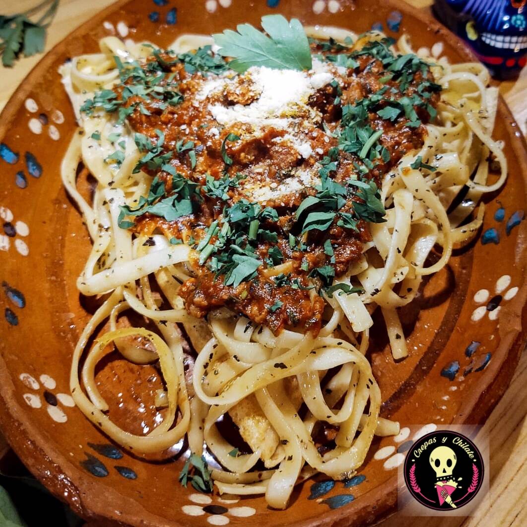 Pasta Fettucine, carne molida a la bolognesa, queso parmesano, perejil y 4 quesos.