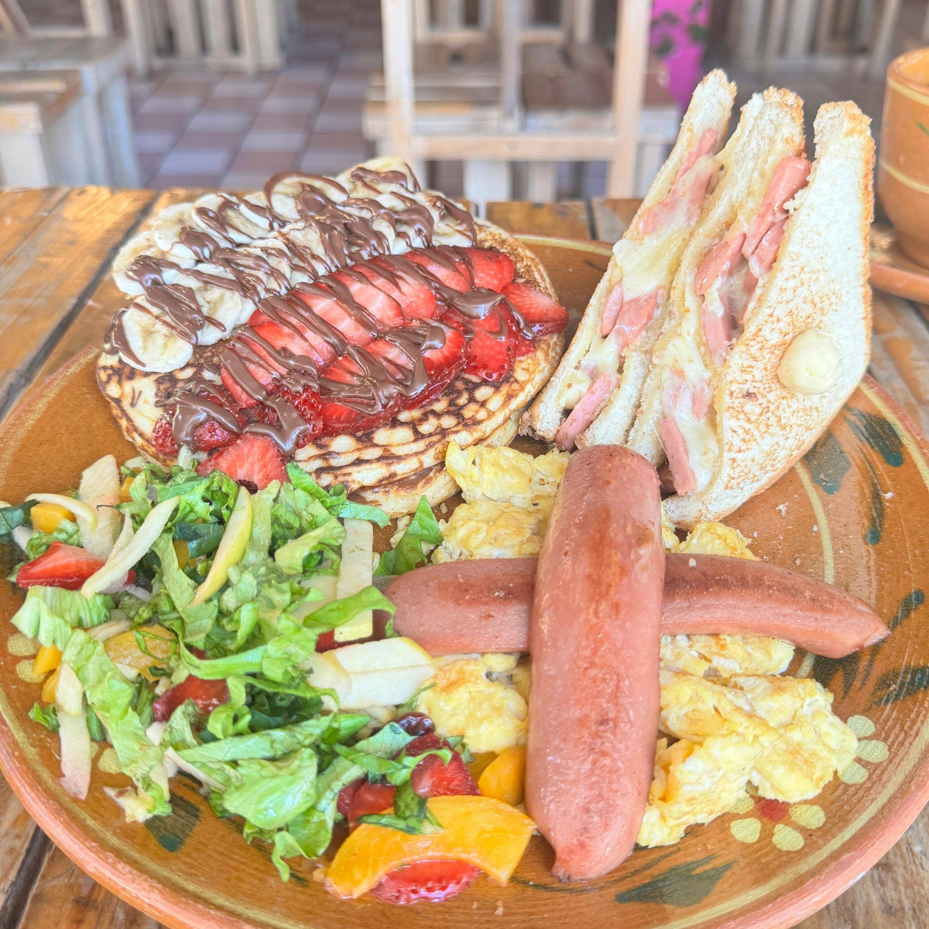 Sandwich de salchicha c/ queso, huevo revuelto, salchicha asada, ensalada, frijoles y 2 hot cakes c/ Nutella, fresa y plátano
