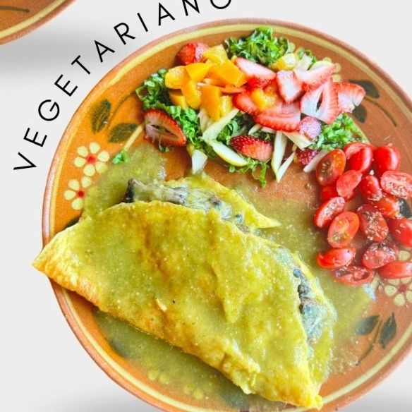 Omelette de queso manchego c/ champiñon y espinaca, bañado en salsa verde, jitomate Cherry y ensalada