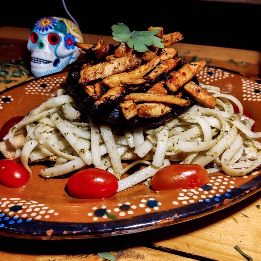 Base de 4 queso, fettuccine la pesto de urugula con nuez, pollo a la miel con pimienta, jitomate cherry y portobello.