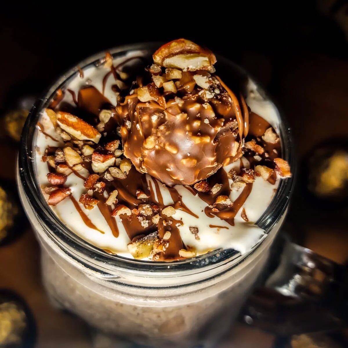 Nutella, fresas, ferrero rocher, helado de fresa y nuez.