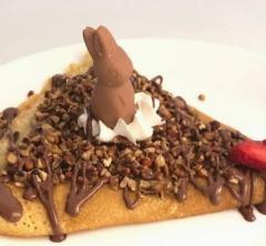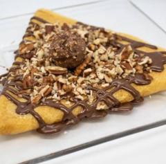 Rebanada de pastel de queso cubierto con Nutella y un Ferrero Rocher