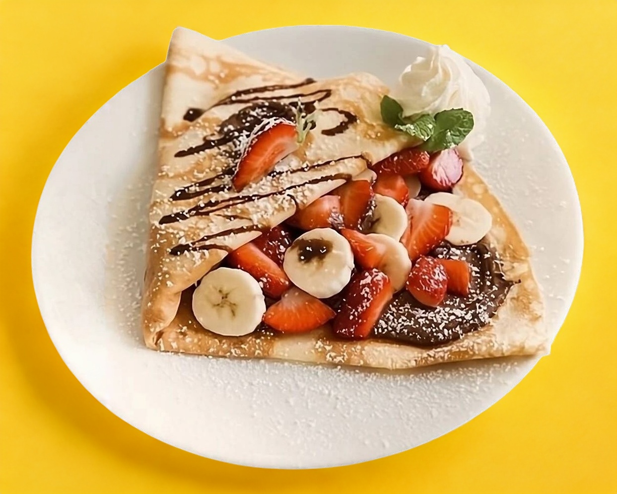 Crepa dulce, personalizada a tu gusto y espolvoreada de azúcar glass y decorada con chocolate hersyes.