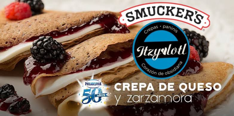 Deliciosa crepa tradicional de queso crema Philadelphia con mermelada de zarzamora Smucker's.