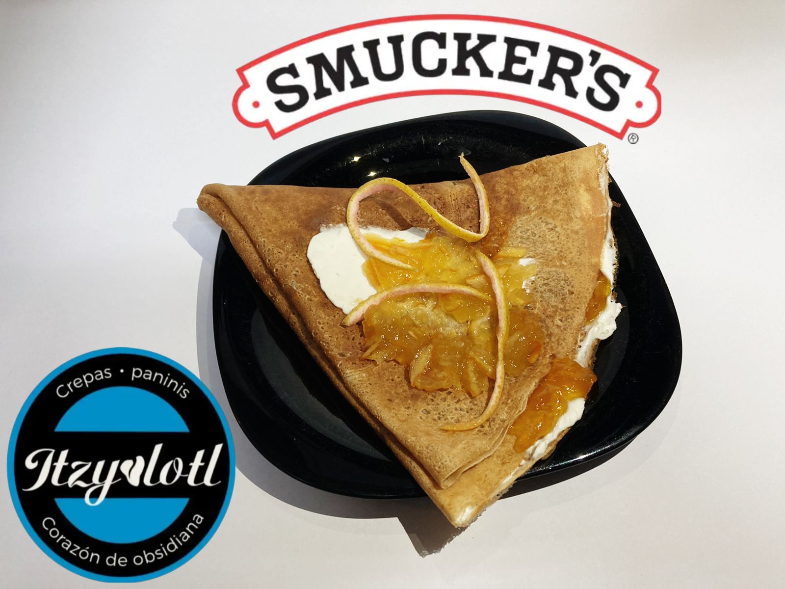 Deliciosa crepa con mermelada de naranja Smucker's con queso crema Philadelphia.