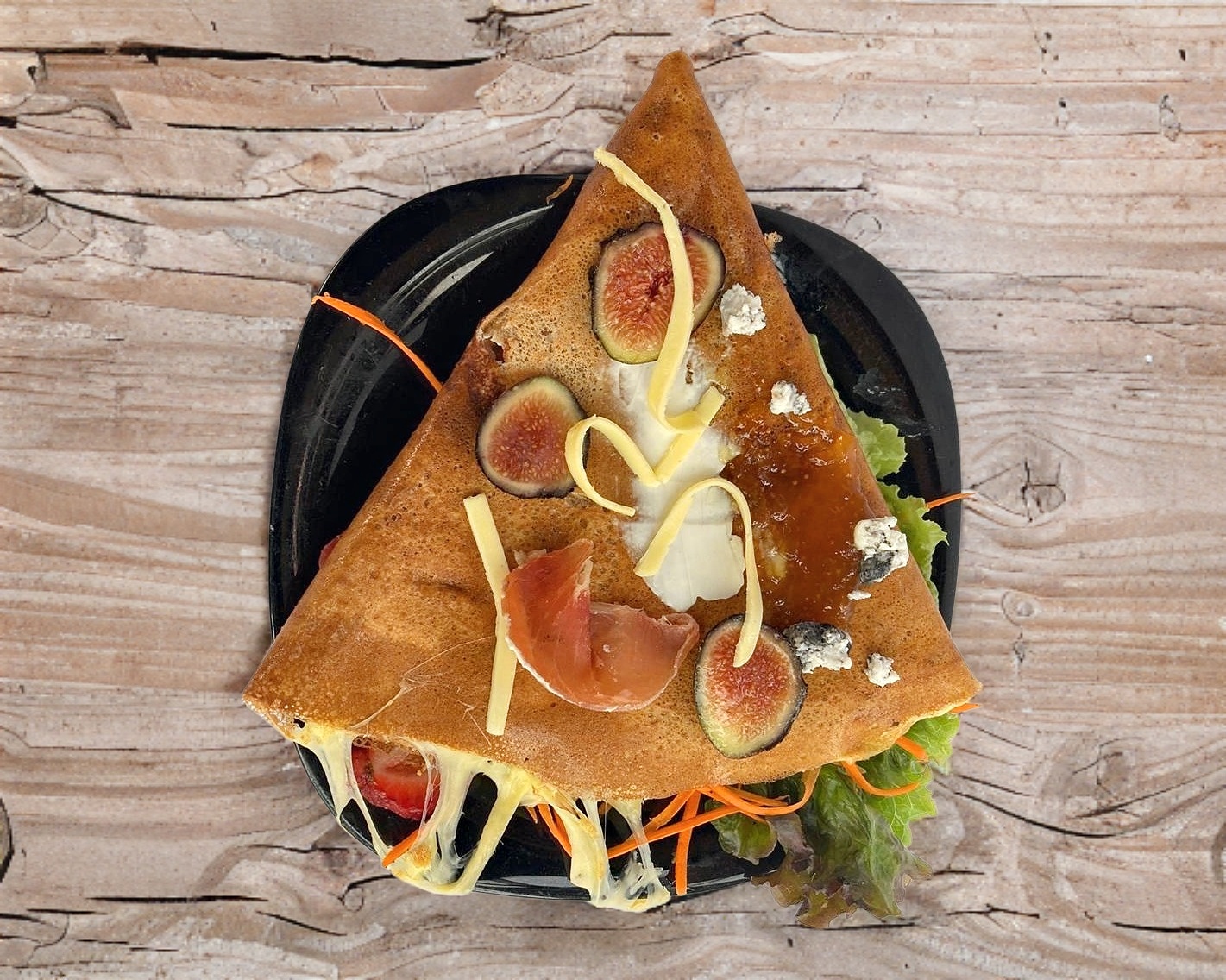Deliciosa crepa con queo de cabra en ceniza y mermelada de fresa