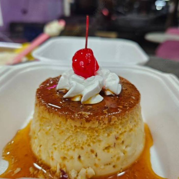 Flan napolitano con caramelo, crema batida y cereza.