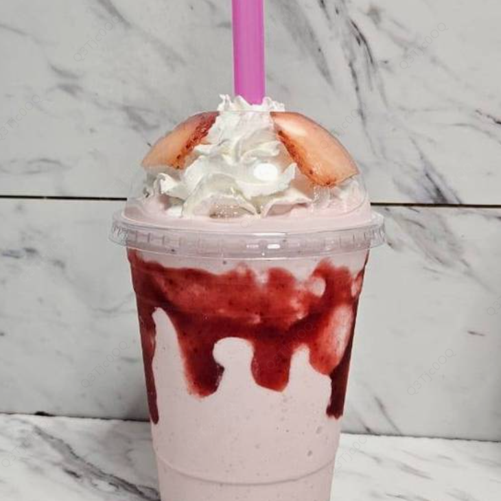Lechera, plátano, Oreo, durazno, crema batida, helado.
