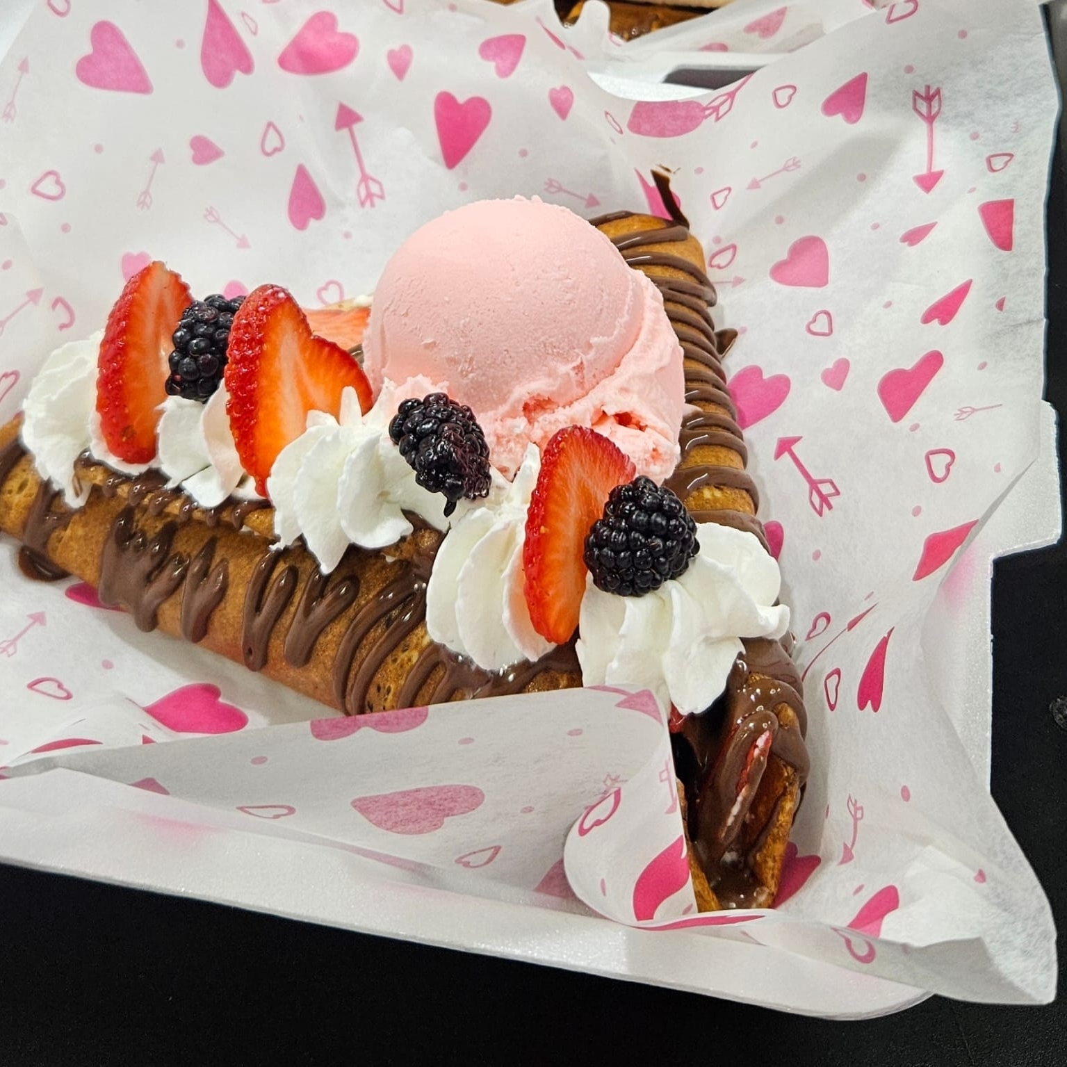 Philadelphia, Nutella, fresas, zarzamoras, crema batida, helado.